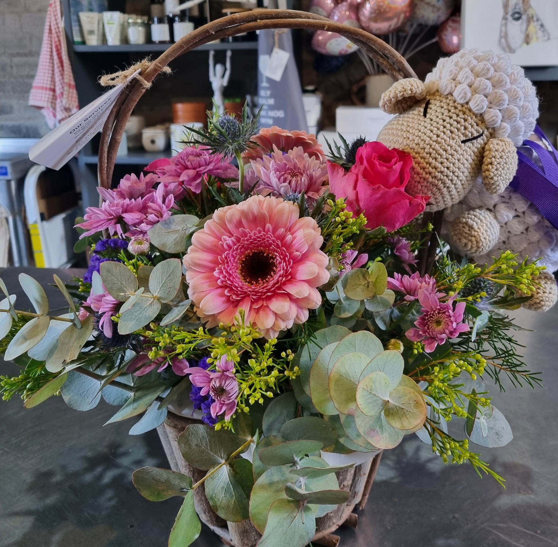 A small basket flower arrangement